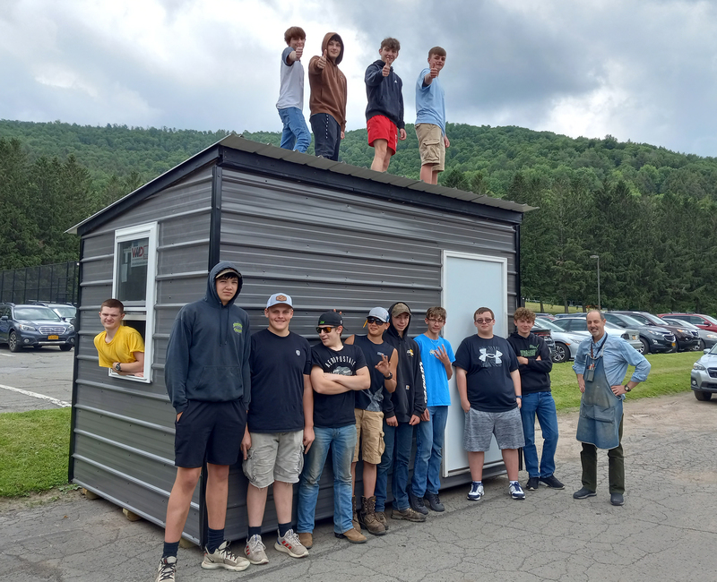 Pictured on the ground (from left): Trent Sparling, Landen Stanton, Landon Taylor, Damien Watson, Edward Salimbangon, Jacob Scofield, Logan Beardslee, James Seward, Noah Tompkins-Covell, and teacher Sal Salvia. On the roof (from left): Austin Miller, Kyle Miller, Nicholas Sarrantonio, and Jayden Hoffmeister.