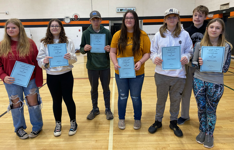 Eighth-grade Honor Roll (from left): Amirrah Budine, Evelyn Brooker, Marco Possemato Jr., Katherine Gorence, Lucas Furgeson, Cale MacNeill, and Payton Landry. Missing: Jayden Campbell, Kraygin Constable, and Savannah Morales.